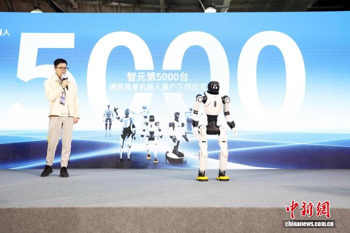 12月8日,智元第5000台通器具身呆板人量产停线典礼正在上海举办。图为:智元团结首创人彭志辉正在典礼现场告示第5000台通器具身呆板人量产停线。中新社记者 汤彦俏 摄